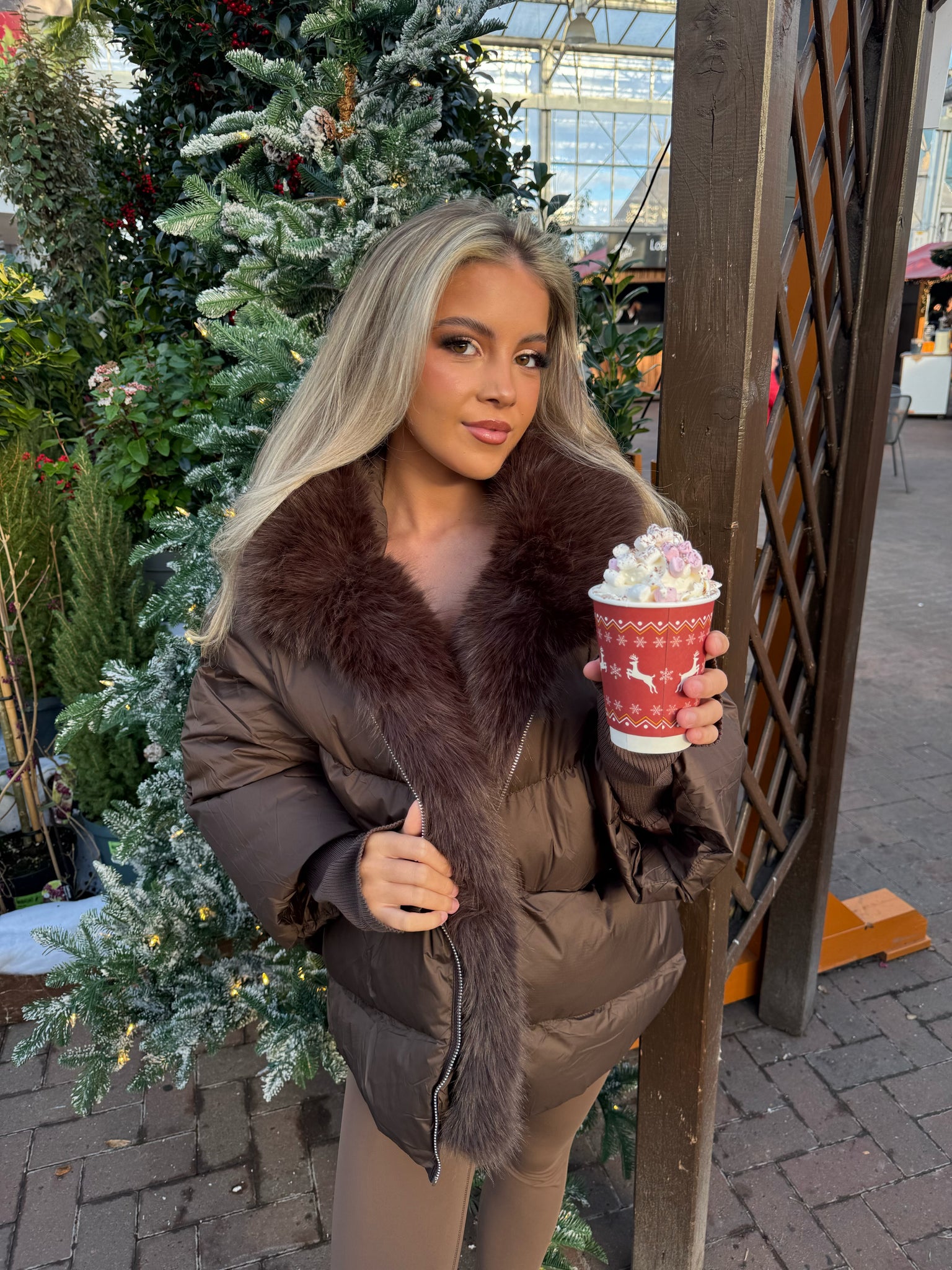 Chocolate brown coat and luxurious brown fur neck line and hood